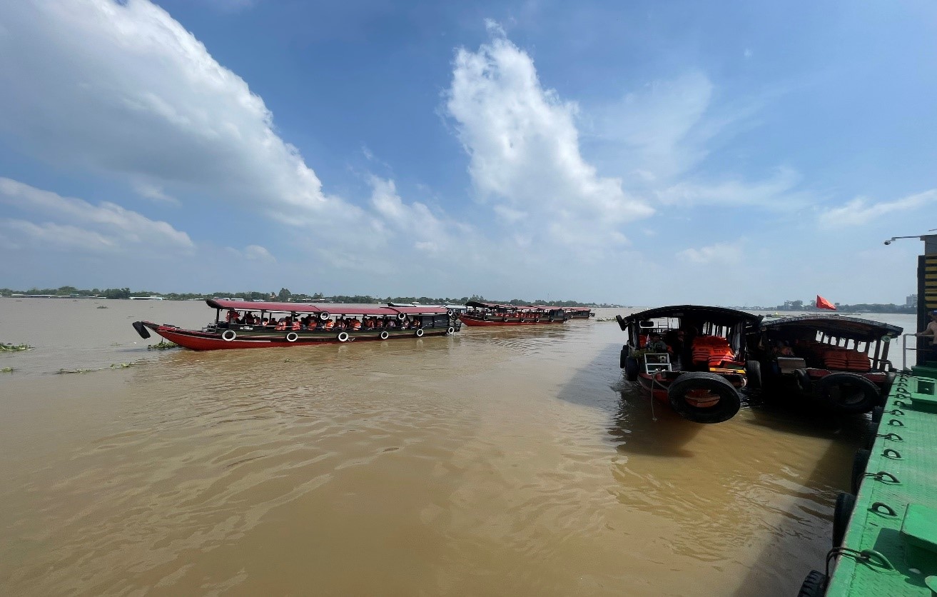 Buổi sáng ở bến cảng thường bắt đầu rất sớm. Khi mặt trời vừa nhô lên khỏi mặt sông, ánh nắng nhẹ nhàng phủ lên những con tàu du lịch neo đậu dọc bến, tạo nên khung cảnh yên bình và thơ mộng. Gió sông thổi mát rượi, mang theo hương phù sa đặc trưng của miền Tây. Từ bến cảng, du khách lên tàu, bắt đầu chuyến hành trình khám phá vẻ đẹp của sông nước và miệt vườn. Con tàu từ từ rời bến, lướt nhẹ trên dòng nước phù sa của Sông Cổ Chiên, đưa du khách rời xa phố thị để đến với không gian thanh bình của làng quê.