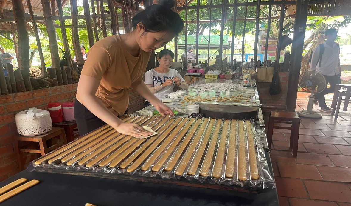Công đoạn cán kẹo dừa tại nhà dừa Coco Home - Ấp Hoà Quí, xã An Bình, tỉnh Vĩnh Long