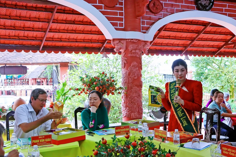 Hoa hậu Emily Hồng Nhung- đại sứ du lịch tỉnh Vĩnh Long, giới thiệu sản phẩm OCOP tỉnh Vĩnh Long tại Nhà gốm Tư Buôi. |