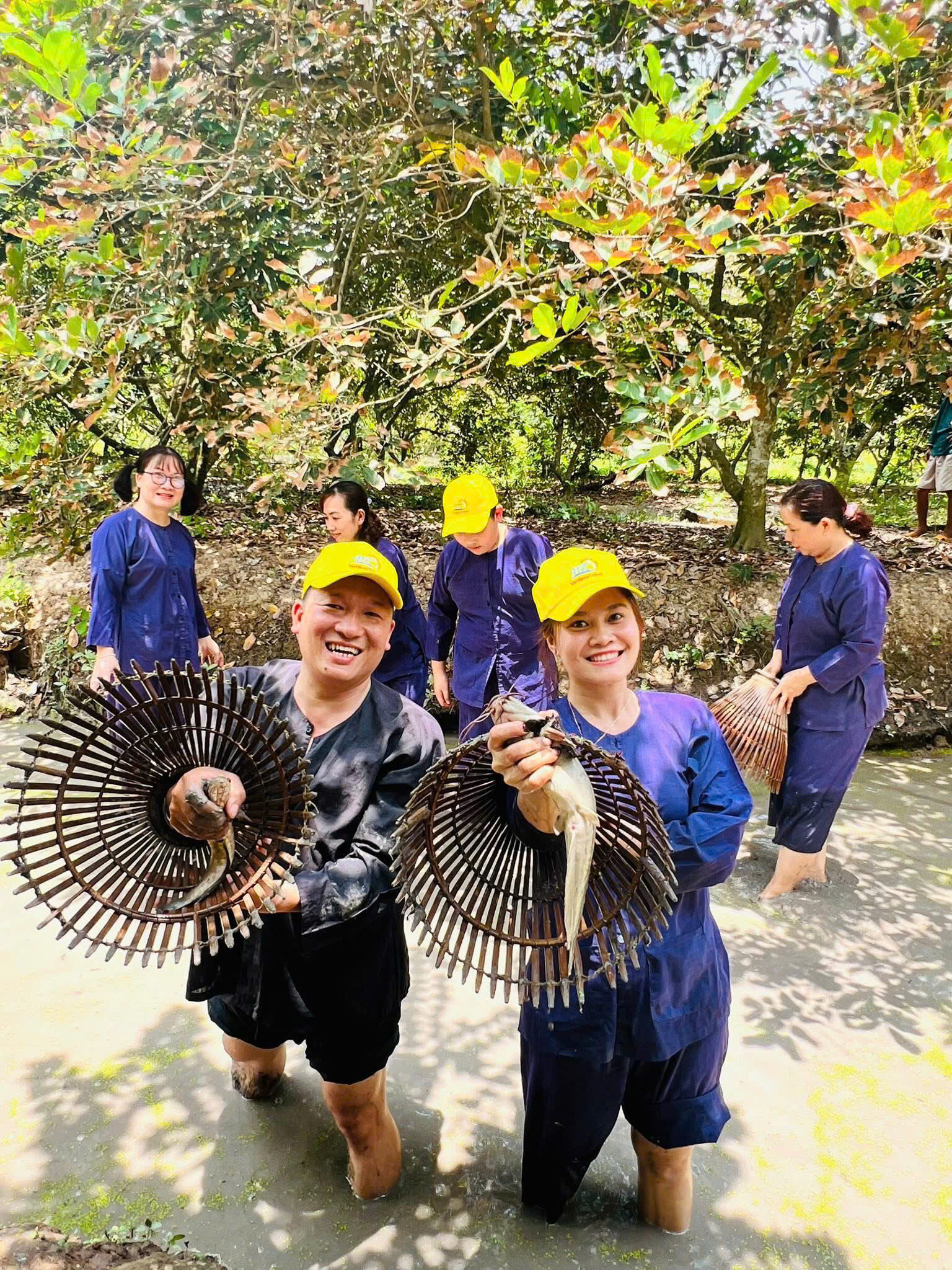 ảnh 1: Du khách trải nghiệm tát mương bắt cá tại Điểm du lịch Vinh Sang.