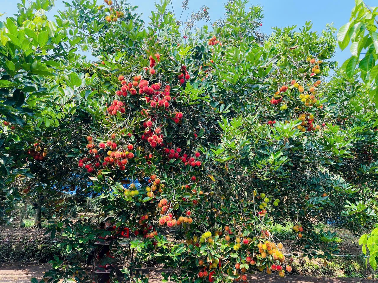 như được thắp sáng bởi sắc đỏ rực rỡ của chôm chôm. Nhìn từ xa, từng vườn cây xanh mướt điểm xuyết những chùm trái đỏ au như ngọn lửa nhỏ nhảy múa giữa tán lá. Mỗi chùm chôm chôm chín mọng là thành quả của nắng mưa, của đất phù sa bồi đắp, của sự chăm chút tỉ mỉ của người làm vườn.
