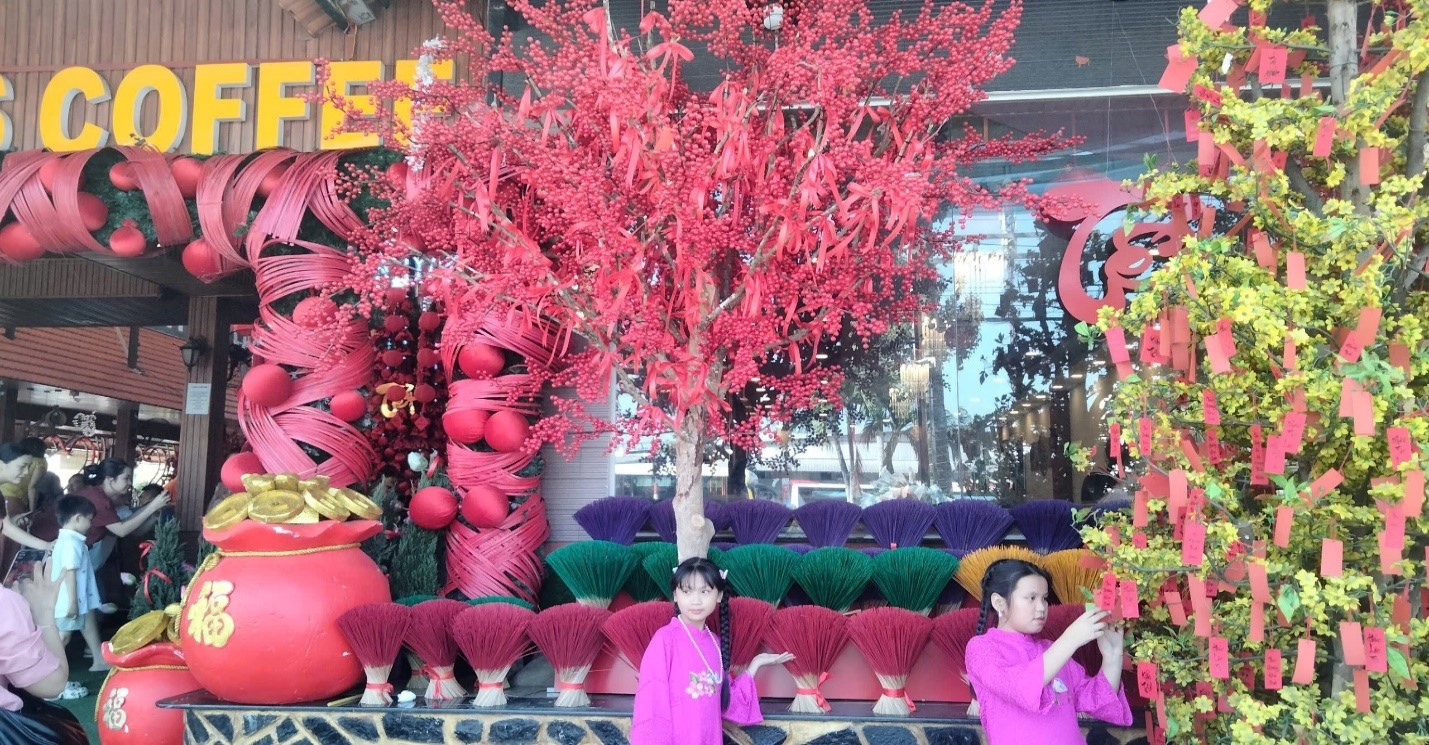 Bên cạnh đó, một số quán cà phê cũng đã trang hoàng không gian quán, khoác lên mình “diện mạo mới” với một màu sắc Tết hết sức ấn tượng và đẹp mắt, quán Lan’s coffee là một trong những quán cà phê tiêu biểu trang trí Tết sớm ở Vĩnh Long với không gian quán rộng rãi, mát mẻ. Năm nay, quán có sự đầu tư thật sự chỉn chu mang một màu sắc Tết hoàn toàn khác lạ so với năm ngoái, mỗi một góc quán sẽ có “background” Tết khác nhau, có góc sẽ là “Làng lụa Hà Đông” mới lạ, góc khác sẽ trang trí cây đào, hoa mai, câu đố, lồng đèn xen kẽ với nhau gây ấn tượng trong lòng thực khách đến đây.